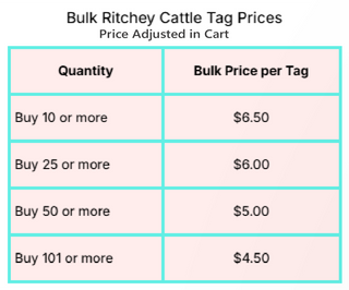 Custom engraved Ritchey livestock ear tags. Made in the USA Ritchey laser engraved tags NEVER fade so you will never have issues reading another ear tag. Designs and text are laser engraved into the tag. They are completely weather proof and will not fade, peel, or rub off and are made to last for the life of of the animal. Customize them with your brand, cows number/name, owner's name/ranch name, address and phone number or include graphics or logos. To add a brand or logo you MUST send me a digitized image of your brand that has been drawn in graphic design software. A back button is included with each tag (if you have questions about which tagger you should use with these, please message me).